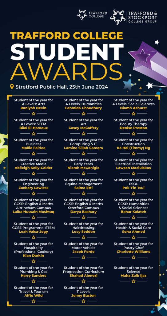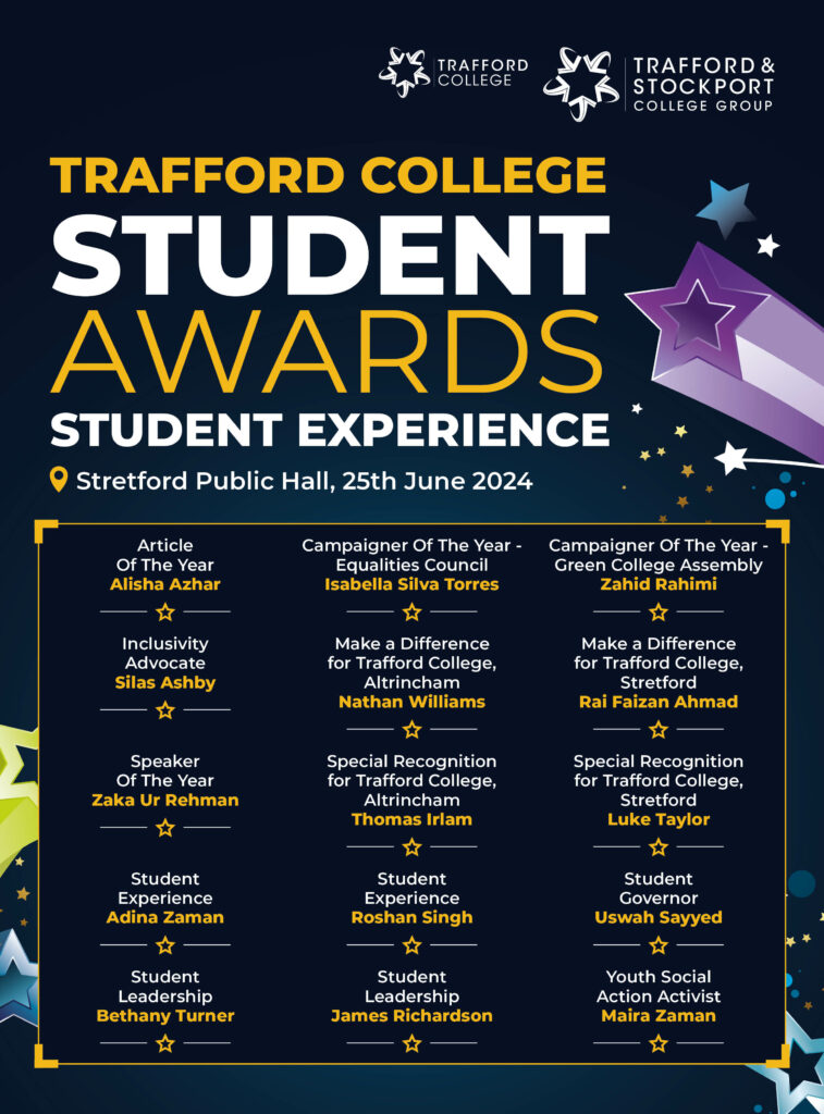 TSCG held its first ceremony to celebrate the annual student awards at Stretford Public Hall on Tuesday 25th June. This event celebrated the achievements of academic success, hard work, student engagement, commitment and dedication from our Trafford College students who study at our Altrincham and Stretford campuses.